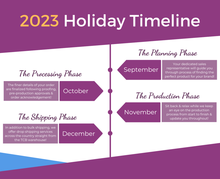 At TCB Promotions, we understand the importance of timely deliveries during the holiday season. That’s why we want to emphasize the significance of staying on track with your holiday timeline and placing your holiday and New Year orders well in advance.